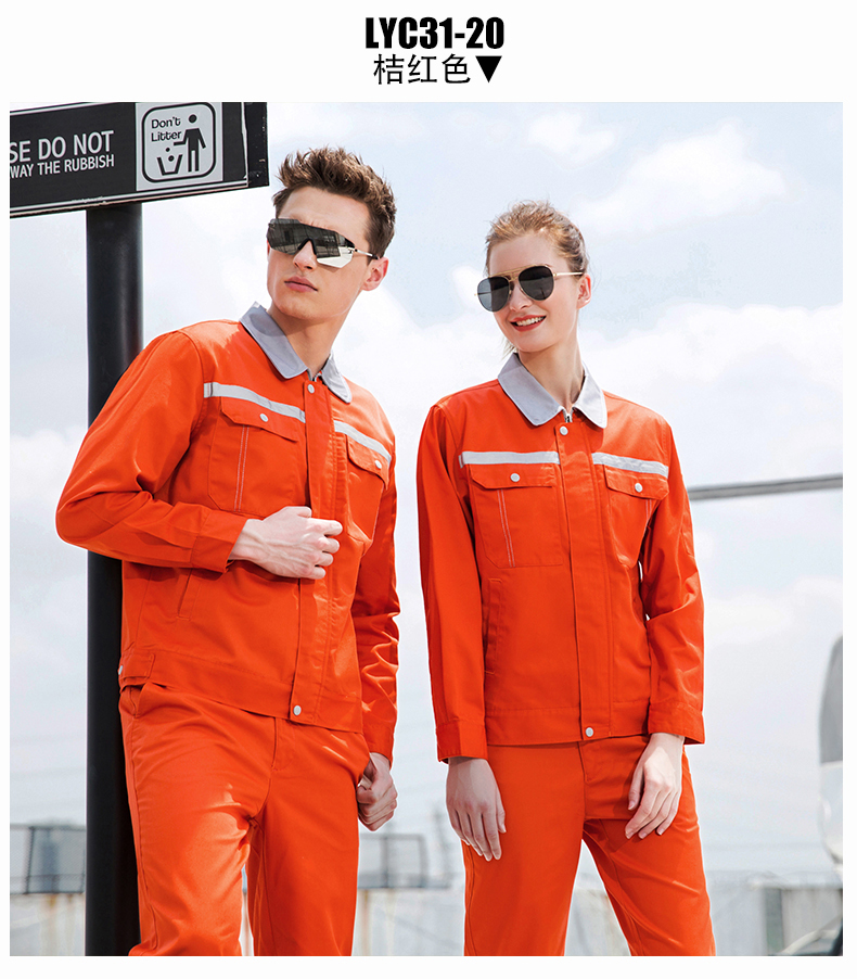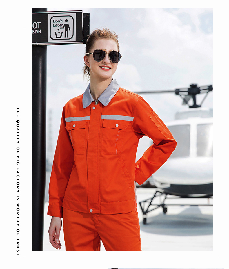 重庆涤棉厚纱卡桔红色长袖反光条工作服