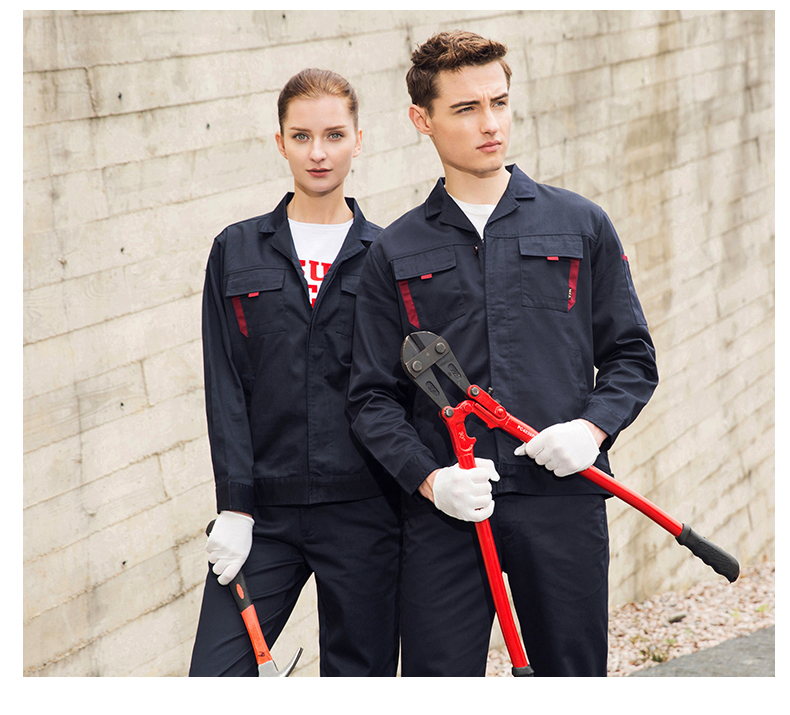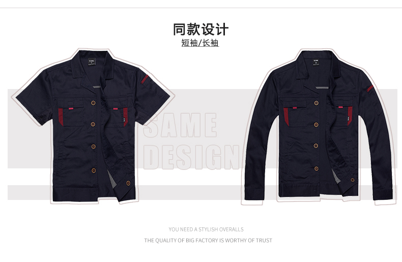 重庆涤棉细斜纹深蓝枣红插色短袖反光条工作服