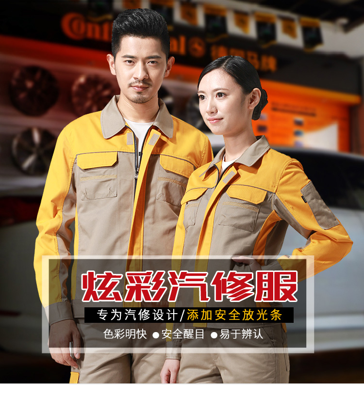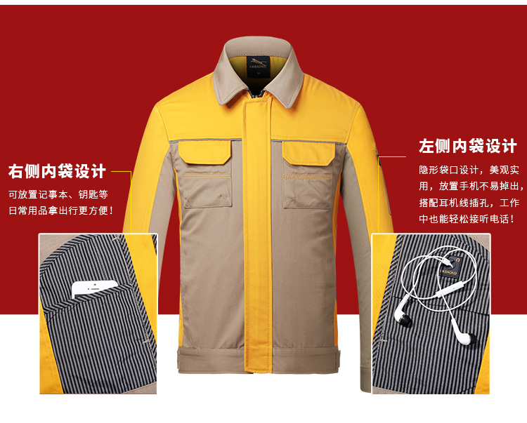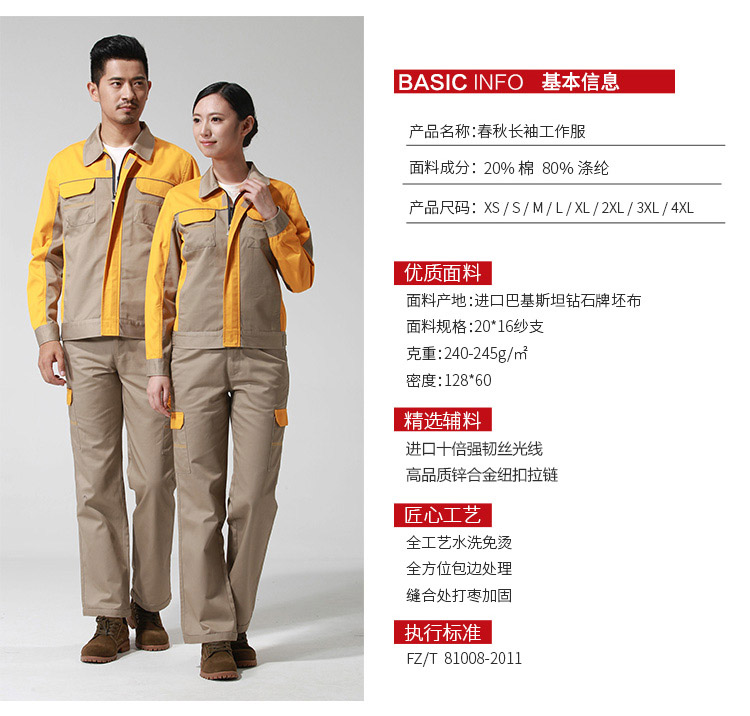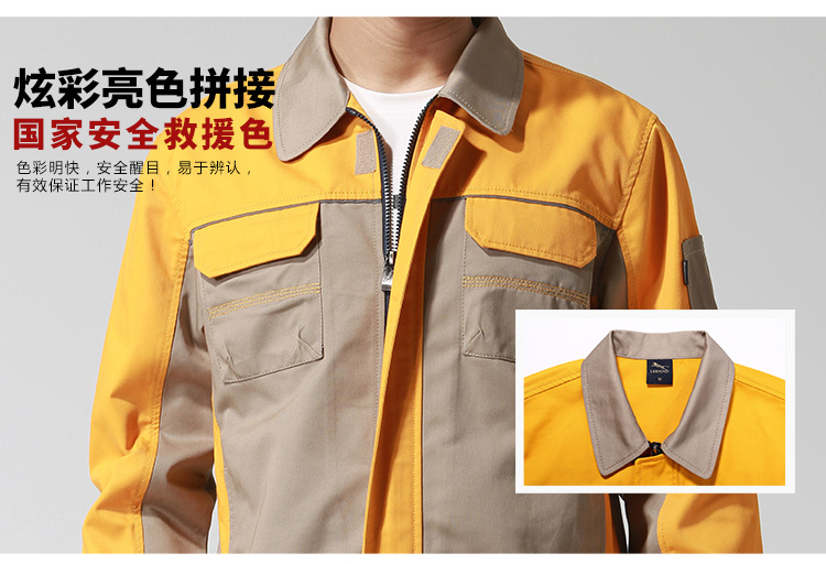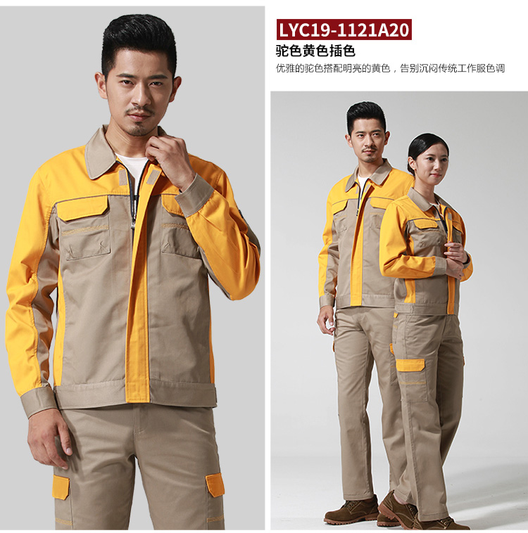 采购:重庆涤棉厚纱卡驼色黄色插色长袖反光条工作服