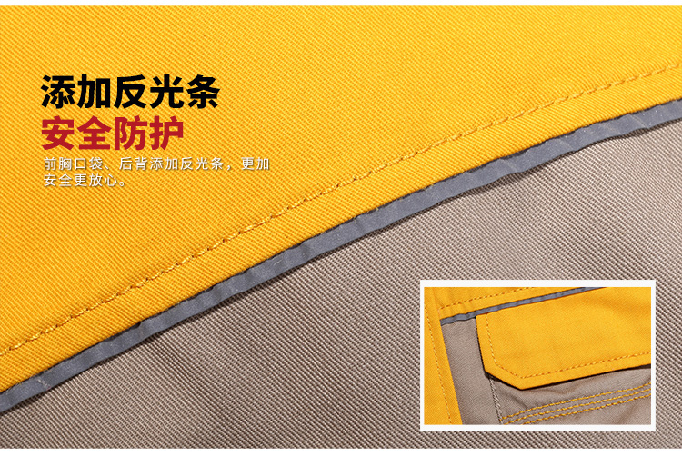 重庆涤棉厚纱卡驼色黄色插色长袖反光条工作服