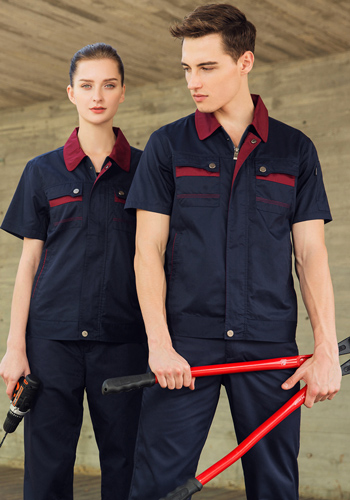 重庆涤棉细斜纹深蓝枣红插色短袖反光条工作服