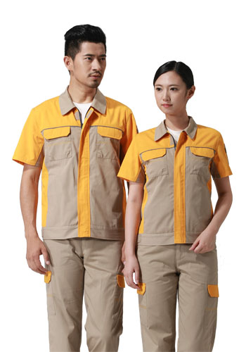 > 重庆涤棉细斜纹驼色黄色插色短袖反光条工作服