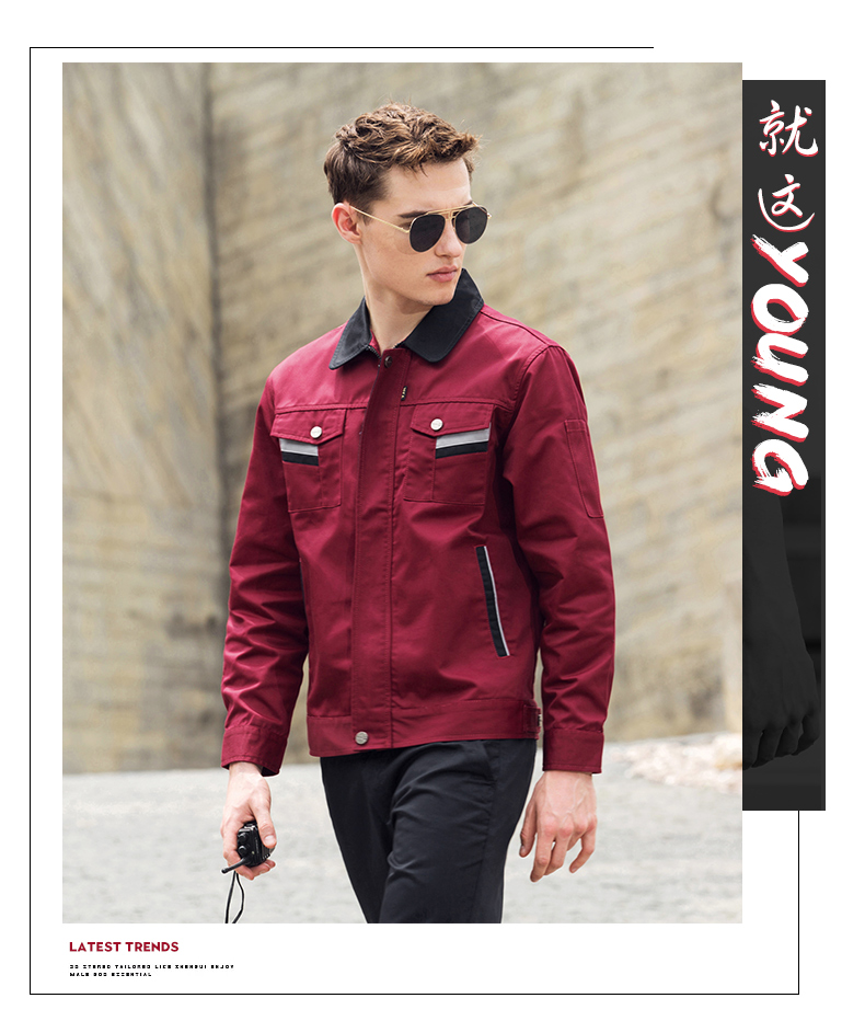 重庆涤棉细斜纹深蓝枣红插色短袖反光条工作服