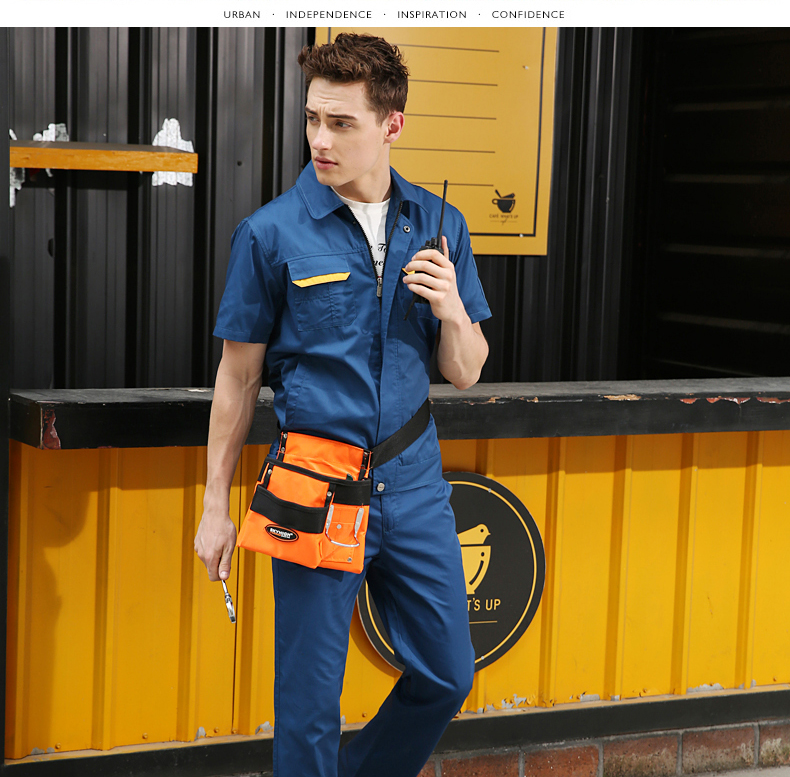 重庆涤棉细斜纹深蓝黄色插色短袖反光条工作服