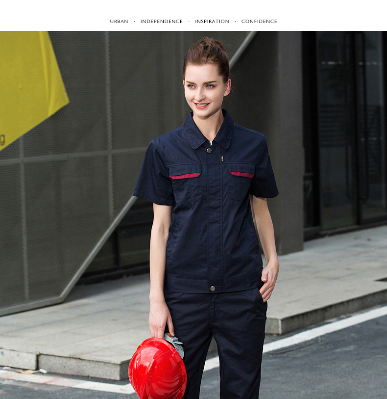 重庆涤棉细斜纹深蓝枣红插色短袖反光条工作服