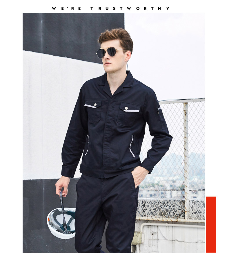 重庆涤棉细斜纹深蓝枣红插色短袖反光条工作服