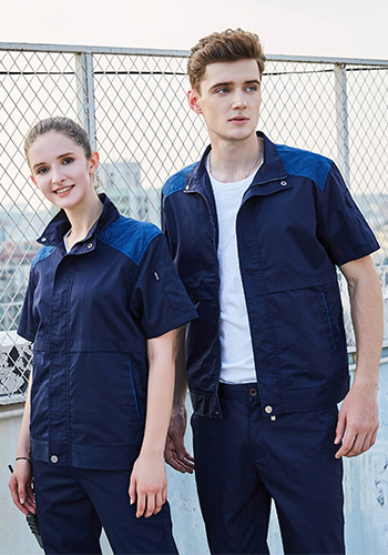 > 重庆涤棉细斜纹深蓝宝蓝插色短袖工作服