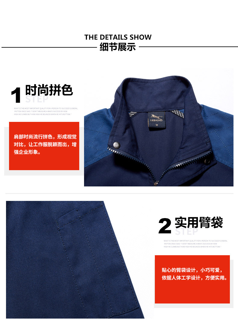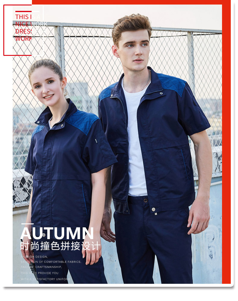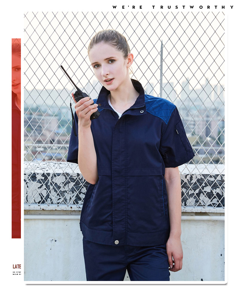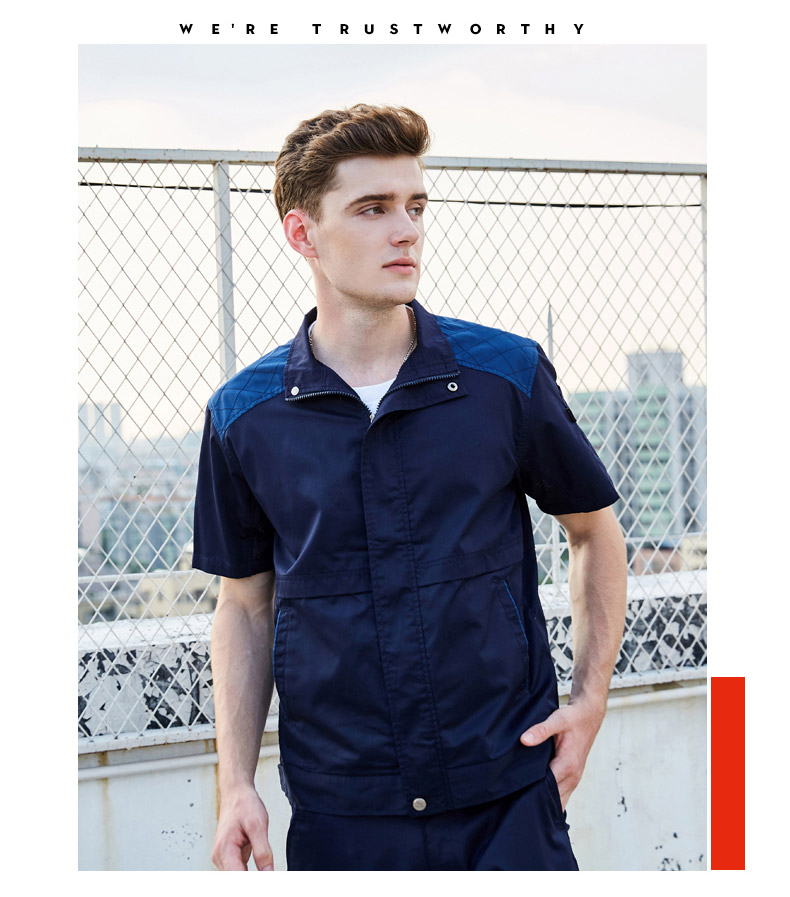 重庆涤棉细斜纹深蓝枣红插色短袖反光条工作服
